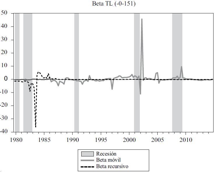 Finalmente, la gráfica 12 del coeficiente del total de obligaciones (0.151198), expresa el mismo comportamiento observado en los resultados anteriores, con la preponderante persistencia en prácticamente toda la muestra del valor de la beta; tanto en la ventana móvil como el recursivo, además de enfatizar el choque del valor extremo tras la crisis del 2001, en el caso de la ventana movible.