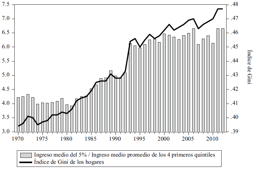 La gráfica 2 muestra el proceso de concentración y redistribución del ingreso, a partir del índice de Gini y el cociente del ingreso medio de los primeros 4 quintiles / el ingreso medio del 5% de mayor ingreso para los hogares; donde es claro, en ambos indicadores, el crecimiento consistente en todo el período, puntualiza así lo referido en cuanto al ingreso de los hogares. La gráfica muestra un cambio estructural al inicio de los años noventa, donde la economía estadounidense, a pesar de caracterizarse por el crecimiento, consecuencia de la revolución de las tecnologías de la información, presenta aceleración en el fenómeno de concentración y redistribución.