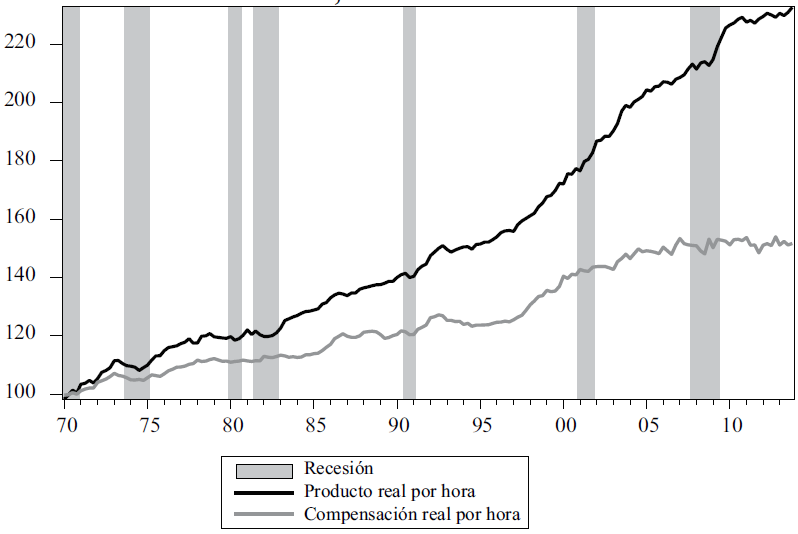 La gráfica 3 del índice base 1970=100 sobre el producto real por hora y la compensación real por hora, muestra cómo durante el periodo persistió en la economía de los Estados Unidos la disociación entre ingresos de los trabajadores y productividad. Es evidente que la dinámica del salario no iguala a la productividad del trabajo, procura así restricción de la demanda; dicha disociación corresponde igualmente con el proceso de redistribución del ingreso; esto presiona a la baja la dinámica de acumulación de la economía.