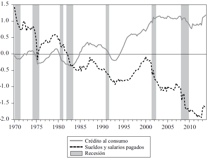 La gráfica 4 representa los valores trimestrales normalizados de los sueldos y salarios pagados y el crédito al consumo de 1970 a 2013; donde resalta la tendencia del consumo personal de las familias a ser financiado de manera creciente por crédito. Esta situación ocurre especialmente a partir de los primeros años de la década de 1990, donde se observa un cambio en la tendencia del crédito al consumo, la cual se acelera mientras los sueldos y salarios pagados mantienen tendencia a la baja. Dicho crecimiento del crédito al consumo puede ocurrir entonces por la sustitución de ingreso por crédito para mantener estándares de vida de los hogares.