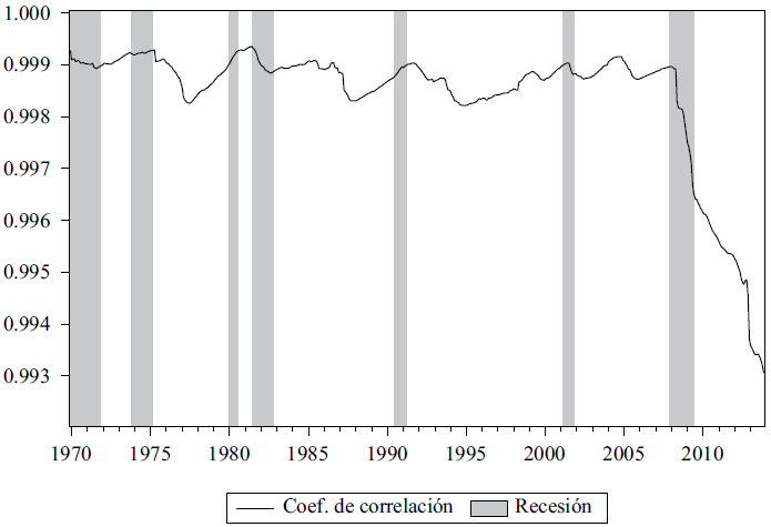 Finalmente, la gráfica 5 muestra el coeficiente de correlación movible de 100 observaciones mensuales, del ingreso disponible y el gasto en consumo personal de 1970 a 2013. Esta gráfica puede entenderse desde la perspectiva keynesiana, donde el principal determinante del nivel de consumo es el ingreso, entonces se espera una correlación lo más cercana a uno, pues la propensión marginal a consumir restringe la igualación.