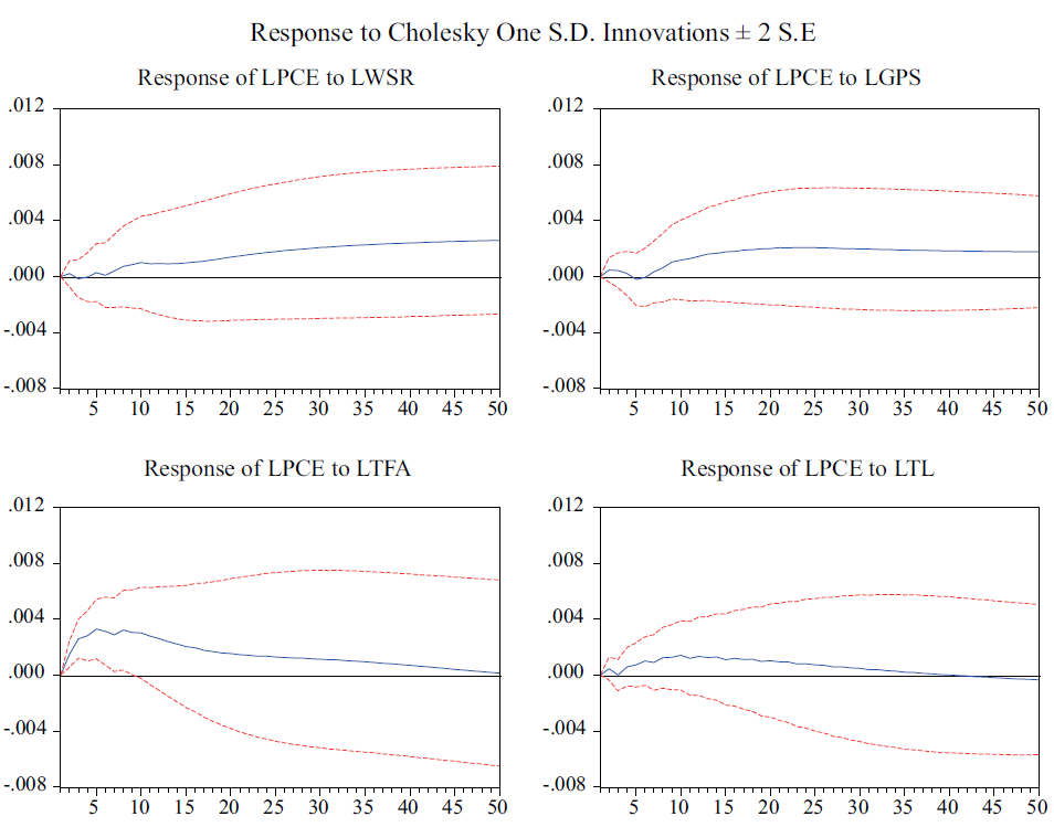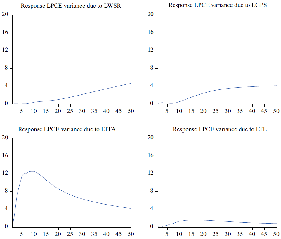 Mientras para el ahorro y salarios, el efecto de la varianza del consumo a causa de estas variables es creciente en el tiempo hasta un 4%.