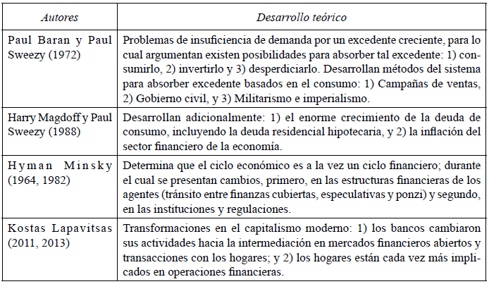 Teóricamente se contribuye a la discusión por medio de una descripción de las características del capitalismo moderno financiarizado, en donde la transformación del entorno económico del capitalismo estadounidense en las últimas cuatro décadas afecta a los hogares dadas las restricciones, ya mencionadas con anterioridad, en la dinámica de los salarios, la creciente innovación en el sector financiero, políticas de privatización y apertura económica; configurando un ambiente en el cual a fin de sostener el nivel de vida se promueve la financiarización del ingreso salarial; influyendo directamente en el consumo y por tanto en el crecimiento del sistema, pues la disponibilidad de crédito determina tanto la dinámica de inversión como del consumo.