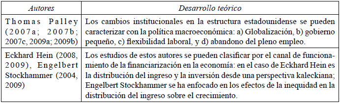 Las condiciones de impulso al sistema financiero estadounidense referidas, se vuelven más importantes para el desarrollo de la economía tomando en cuenta que Minsky (1964) , explica al ciclo económico como un ciclo financiero a la vez, en la fase de expansión presenta sistemáticamente cambios institucionales que modifican la estructura financiera y, por lo tanto, el funcionamiento de estos mercados. Posteriormente, en la primera década de los años 2000, Palley (2007 a) resalta que el capitalismo estadounidense moderno financiarizado es caracterizado por cambios institucionales importantes, fundamentalmente por medio de tres conductos: 1) la estructura y operación de los mercados financieros, 2) el comportamiento de las corporaciones no financieras; y 3) la política macroeconómica, donde sobresale el hecho de cómo estas transformaciones del capitalismo estadounidense son funcionales al fin de asimilar excedente con mayor eficiencia.