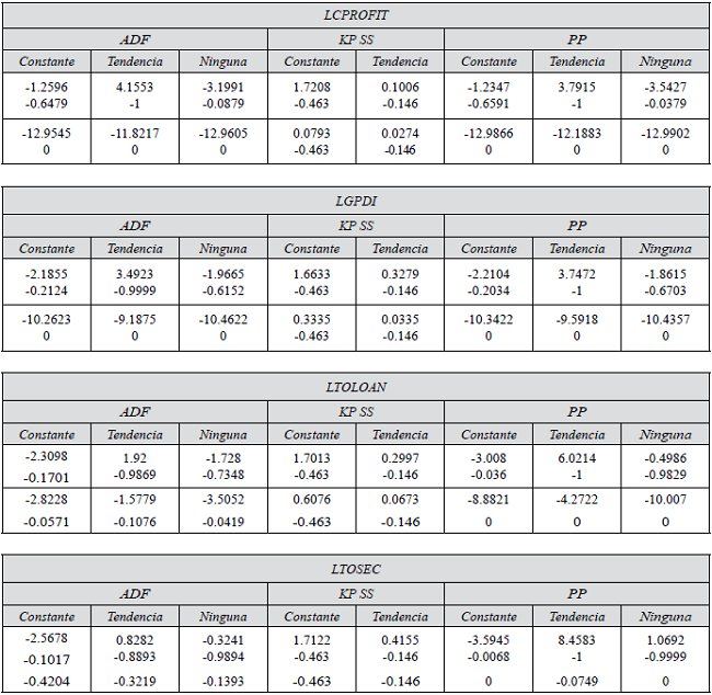 Es decir, el consumo en función de las fuentes de financiamiento interno, compuesto por los ingresos corrientes (sueldos y salarios) y la riqueza financiera (ahorro y activos financieros); y el financiamiento externo (obligaciones financieras). La tabla 1 muestra el resumen de las pruebas de raíces unitarias; donde se reportan el valor del estadístico t y entre paréntesis la probabilidad, se observa que las pruebas determinan grado de integración I (1) para todas las variables.