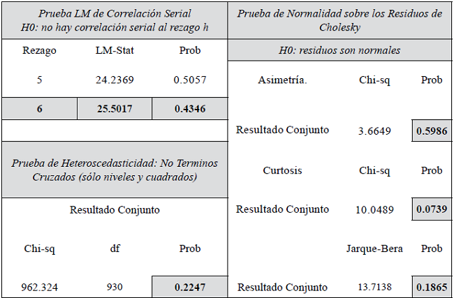 El modelo final fue un VAR 6, con dos variables dummy de salto: 1) para el segundo trimestre de 2008 y 2) para el cuarto trimestre de 2008. La tabla 2 resume las pruebas sobre los residuales, las cuales validan que presenta no correlación serial, homoscedasticidad y normalidad, al satisfacer todas las pruebas con una probabilidad mayor a 0.05, al 95%.
