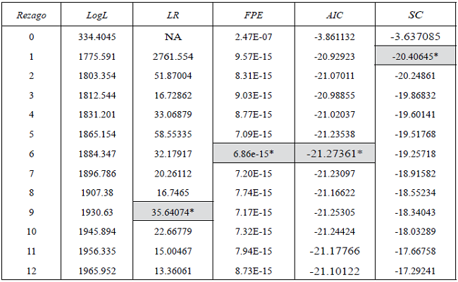 A continuación se reporta en la tabla 4 el resumen del criterio de selección de rezagos para el modelo.