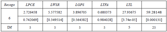 En la tabla 5 se presenta la prueba de exclusión de rezagos donde se muestra que al rezago 6 en conjunto son estadísticamente significativos respaldando así la selección de rezagos.