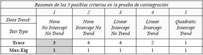La prueba de cointegración presentada en la tabla 6, da como resultado la existencia de al menos un vector de cointegración en todos los modelos posibles, al final de la evaluación se seleccionó el criterio 1, el cual mostró un vector de cointegración satisfactorio en términos de la teoría: