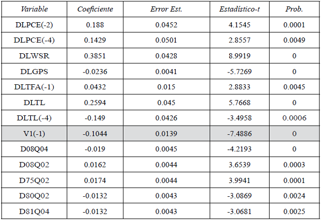 El vector de cointegración aceptado para la elaboración del mecanismo corrector de errores (MCE), fue el siguiente: