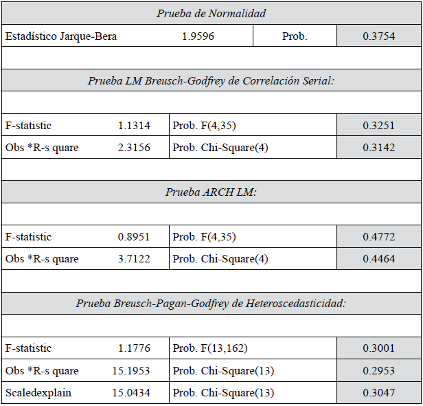 Como se observa, el MCE representado por la variable V1 (-1) tiene un valor menor a la unidad, es negativo y significativo estadísticamente como se esperaba para confirmar la existencia de cointegración entre las variables. Adicionalmente, se muestran en la tabla 9 las pruebas sobre los errores del modelo, donde se aprecia la aprobación de las pruebas de correlación serial, heteroscedasticidad y normalidad.