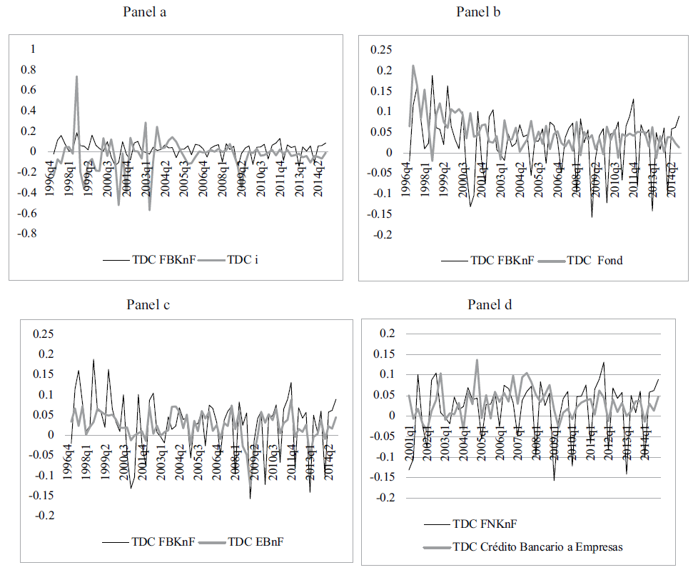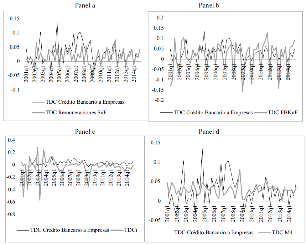 Con respecto a las variables que están relacionadas al crédito bancario de las empresas (panel a) se observa una relación fuerte entre la tasa de crecimiento del crédito bancario a las empresas con la tasa de crecimiento de las remuneraciones del sector no financiero, a pesar de la disparidad que presentan durante el periodo de 2007-2008, explicado por la vulnerabilidad externa de la economía mexicana ante la crisis financiera global, iniciada en 2007. En el panel b se observa que no existe una relación fuerte entre la tasa de crecimiento del crédito bancario a las empresas y la tasa de crecimiento de la formación bruta de capital fijo del sector no financiero. En el panel c no se observa una relación robusta entre la tasa de crecimiento del crédito bancario a las empresas y la tasa de crecimiento de la tasa de interés. Finalmente, en el panel d se muestra que existe una relación débil entre crédito bancario a las empresas con la tasa de crecimiento del agregado monetario más amplio, que se representa a través de M4.
