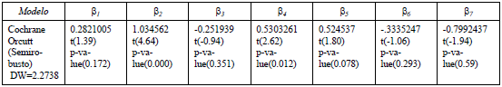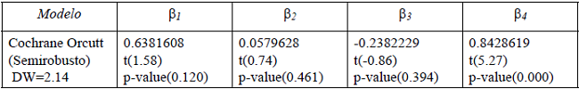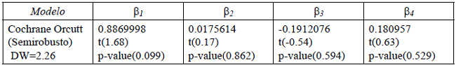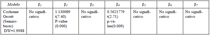 Dichas ecuaciones se estiman con base en el método de Cochrane Orcutt, semi-robusto,2 cuyo objetivo es controlar problemas de autocorrelación serial de primer orden y de heterocedasticidad. Para ello, primero se presentan las estimaciones de cada ecuación sin eliminar las variables redundantes, a fin de determinar el signo de los coeficientes, para después presentar el modelo en su versión final.