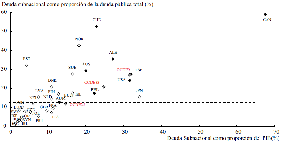 Los niveles de deuda pública se analizan comúnmente en términos proporcionales: suele ser más descriptivo observar el nivel de la deuda como proporción del Producto Interno Bruto para reconocer si se trata de un nivel de endeudamiento alto o bajo. De la misma manera, los niveles de deuda subnacional se miden en proporción a la deuda pública total, como medio de conocer su impacto en las finanzas públicas. Según la información de la OCDE (2018), la proporción de la deuda de los estados suele ser superior a la de los gobiernos locales.