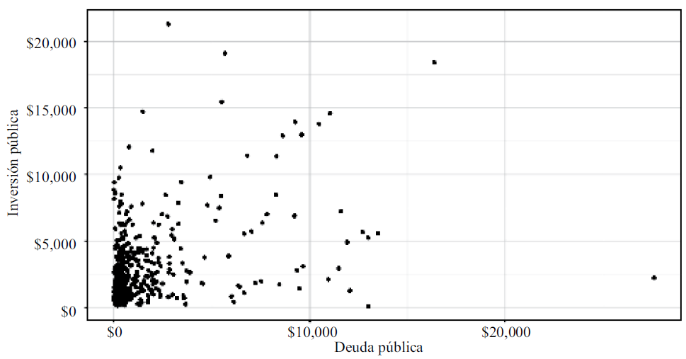 En realidad, no es de esperarse que la causa principal de la inversión pública sea el nivel de deuda pública en un estado. En otras palabras, es necesario tomar en cuenta que la contratación de deuda pública tiene otros destinos además de su uso en inversión pública, como el gasto corriente y el financiamiento de programas sociales. Además, es importante notar que, a pesar de que en la Ley de Disciplina Financiera de las Entidades Federativas y los Municipios (2018) se exige que las entidades incluyan en sus leyes de ingresos y proyectos de presupuestos de egreso modelos de riesgo, planes y estrategias, el destino de la deuda pública no siempre es claro y las proporciones de los rubros de su aplicación no es homogénea. Por ejemplo, Astudillo & Porras (2018) encontraron que, a pesar de ser factible conocer los niveles y montos de deuda, es imposible hacer un seguimiento fiel a su destino. Más aún, el nivel de opacidad es tal que dificulta determinar si la deuda pública es útil para incrementar la capacidad productiva.