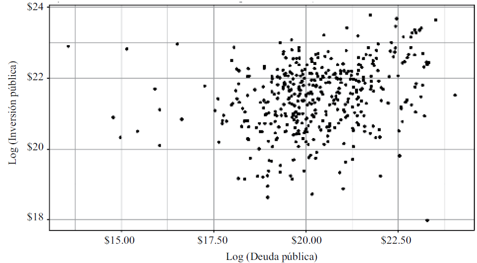 Para el presente análisis, se usa la información de los niveles de deuda pública y de inversión pública que presenta el Instituto Nacional de Estadística y Geografía (INEGI) en las 32 entidades federativas en el periodo de 2003 a 2016. La relación entre los niveles de deuda y los niveles de inversión no es evidente a simple vista. Considere la figura 1 y observe que, en niveles, es difícil observar una relación concreta entre estas dos variables. Cuando parece haber un efecto entre dos variables, pero este está muy disperso, es posible considerar que la escala en la que se están midiendo las variables no sea la apropiada. Una posibilidad es modificar la escala de las variables para notar el efecto que causan entre sí. Una transformación común que nos permite esto es aplicar logaritmo natural a los niveles de deuda pública e inversión pública.