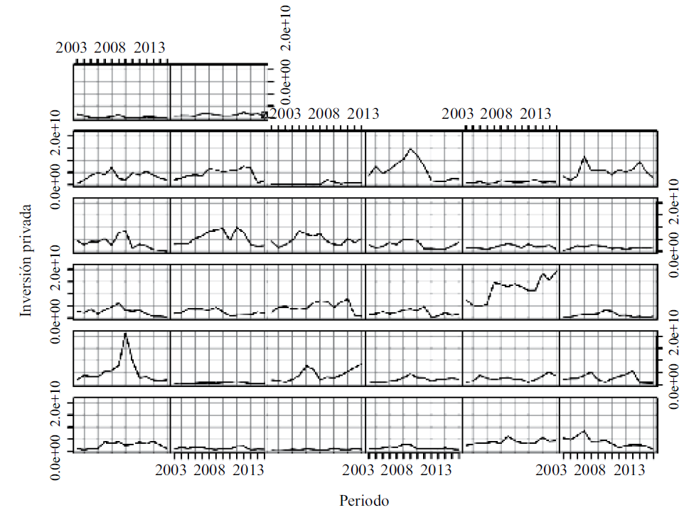 En la figura 3 se presenta el valor de la inversión para los 32 estados como una serie de tiempo. Es posible observar entonces que existe un grado de heterogeneidad en el tiempo y entre estados, que es necesario considerar en el modelo. A este tipo de análisis se le conoce en la literatura como un modelo de datos en panel, el cual puede ser de efectos fijos o efectos aleatorios, según los supuestos que se consideren apropiados para modelar el comportamiento de las variables. En un modelo de efectos fijos, por ejemplo, se considera que el efecto en el tiempo puede ser constante, a pesar de las diferencias entre estados. Sin embargo, se puede también considerar que estos efectos no sólo no son fijos, sino que además se ignora su comportamiento. Esta información que se ignora es posible incorporarla al modelo por medio de efectos aleatorios. De acuerdo a las pruebas estadísticas realizadas en la información, en este caso se ha determinado el uso de un modelo de efectos aleatorios.