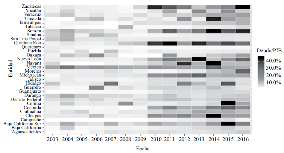 Como se puede observar en las figuras 2 y 3, los niveles de deuda varían mucho en el tiempo y entre estados. Estas variaciones se pueden visualizar mejor en la figura 5, donde se muestra la proporción de la deuda con respecto al Producto Interno Bruto en las 32 entidades federativas para el periodo de este estudio de 2003 a 2016. Esta figura muestra un mapa de calor en el que la coloración más intensa representa un nivel mayor de endeudamiento del estado con respecto a su ingreso. Para su mayor comprensión, se toma como nivel máximo de endeudamiento un 50% del PIB, donde los colores más oscuros se observan con niveles de deuda del 50% o superior.