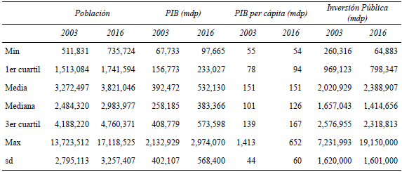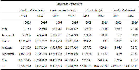 Para este análisis se hace uso de una base de datos en panel que considera a los 32 estados de la república mexicana en el periodo de 2003 a 2016, donde se incluye el PIB a nivel estatal recabado por el INEGI. Junto con las estimaciones de población en el mismo periodo, esta información permite estimar el PIB per cápita a nivel estatal. Se incluye información de las finanzas públicas estatales: en particular se considera la inversión privada, los egresos por deuda pública y las cuentas que suman el gasto corriente. Adicionalmente, se incluye la inversión extranjera directa de acuerdo a datos de la Secretaría de Economía (SE). Todos estos datos se capturan en pesos mexicanos de 2013. Adicionalmente, se incluye el nivel de escolaridad de la población, medida en años de estudio.