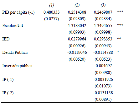 La relación entre la deuda pública y el crecimiento depende de que la primera sea utilizada para financiar la segunda por medio de la inversión pública. Esto no se llega a capturar en este primer modelo, pero es posible modelar también la relación existente entre la inversión pública y la deuda pública. Finalmente, note que la correlación entre los años de escolaridad y la inversión extranjera directa y el PIB per cápita es altamente significativa. Además, el coeficiente de la escolaridad sugiere un efecto fuerte y positivo entre estas variables.