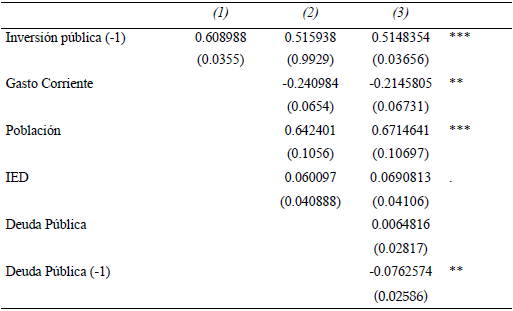 El modelo estima el valor rezagado de la deuda pública como variable explicativa, considerando que los efectos de esta en la inversión pública no se generan instantáneamente, sino que el nivel de deuda pública en un año cualquiera tiene efectos sobre el nivel de inversión del año siguiente. Se encuentra que la correlación entre estas dos variables es negativa y altamente significativa. Esto podría interpretarse como que el nivel de deuda pública genera desincentivos a la inversión pública, sin embargo, las causas de esta relación no están claras. Una explicación de esto es que el nivel de las obligaciones del estado genera presiones al gasto que se reflejan en una disminución en el nivel de inversión pública.