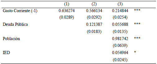 Donde lit representa el nivel de inversión del estado i en el año t, Xit contiene el gasto corriente, el tamaño de la población y la inversión extranjera directa. Finalmente, Dit expresa el tamaño de la deuda pública en el estado. La estimación de los valores de este modelo se presenta en el cuadro 3.
