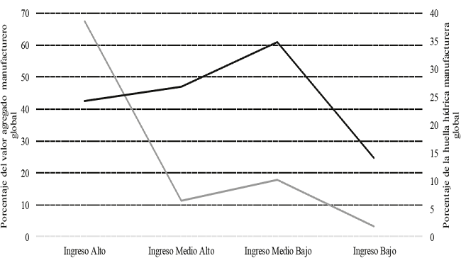 Existe una marcada diferencia entre las huellas hídricas de los cuatro grupos de países. La HH manufacturera de mayor magnitud se concentra en los países de ingreso medio-bajo con el 43.1% del total del consumo manufacturero de agua. Las economías de ingreso alto consumen el 20.8% del total, proporción apenas mayor al 19.9% correspondiente a los países de bajo ingreso. Por último, las naciones caracterizadas por un ingreso medio-alto agrupan el 16.2% del consumo mundial de agua para uso manufacturero industrial.