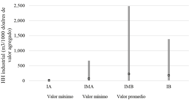Si se considera la huella hídrica por unidad de valor agregado manufacturero y el hecho que los países de ingreso alto son los de menor consumo de agua per cápita, el patrón anterior también sugiere que este grupo de países es más eficiente en el uso del agua. En este sentido, el consumo de agua para generar mil dólares de valor agregado representa apenas el 14% de la consumida por los países con ingreso medio-alto, 4.4% la de países LMI y 5.5% la de países de bajo ingreso, lo que contrasta con los hallazgos de Hoekstra y Chapagain (2007)). En concreto, los países de ingreso medio-bajo son los de mayor huella hídrica por mil dólares de valor agregado, seguidos por los países de bajo ingreso y los de ingreso medio-alto. Adicionalmente, los valores máximos y mínimos de la HH manufacturera de este grupo son todos menores a estos mismos valores de los otros tres grupos de referencia (figura 2).