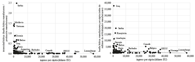 Para inspeccionar el desequilibrio de la HH manufacturera entre grupos de países clasificados por nivel de ingreso, en la figura 3 se muestra la dispersión entre, por un lado, la huella hídrica manufacturera per cápita e intensidad hídrica y, por el otro, el ingreso per cápita. Se observa una ligera relación lineal con pendiente negativa entre estas variables. Así, los países de mayor ingreso tienden a registrar tanto una menor intensidad hídrica como menor huella hídrica per cápita, sugiriendo procesos industriales más eficientes respecto al consumo de agua. La figura 3 parece confirmar la existencia de desequilibrios en la HH manufacturera entre grupos de países.