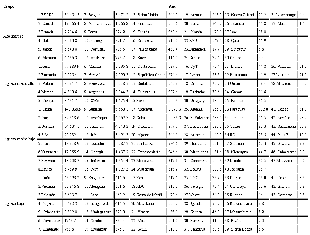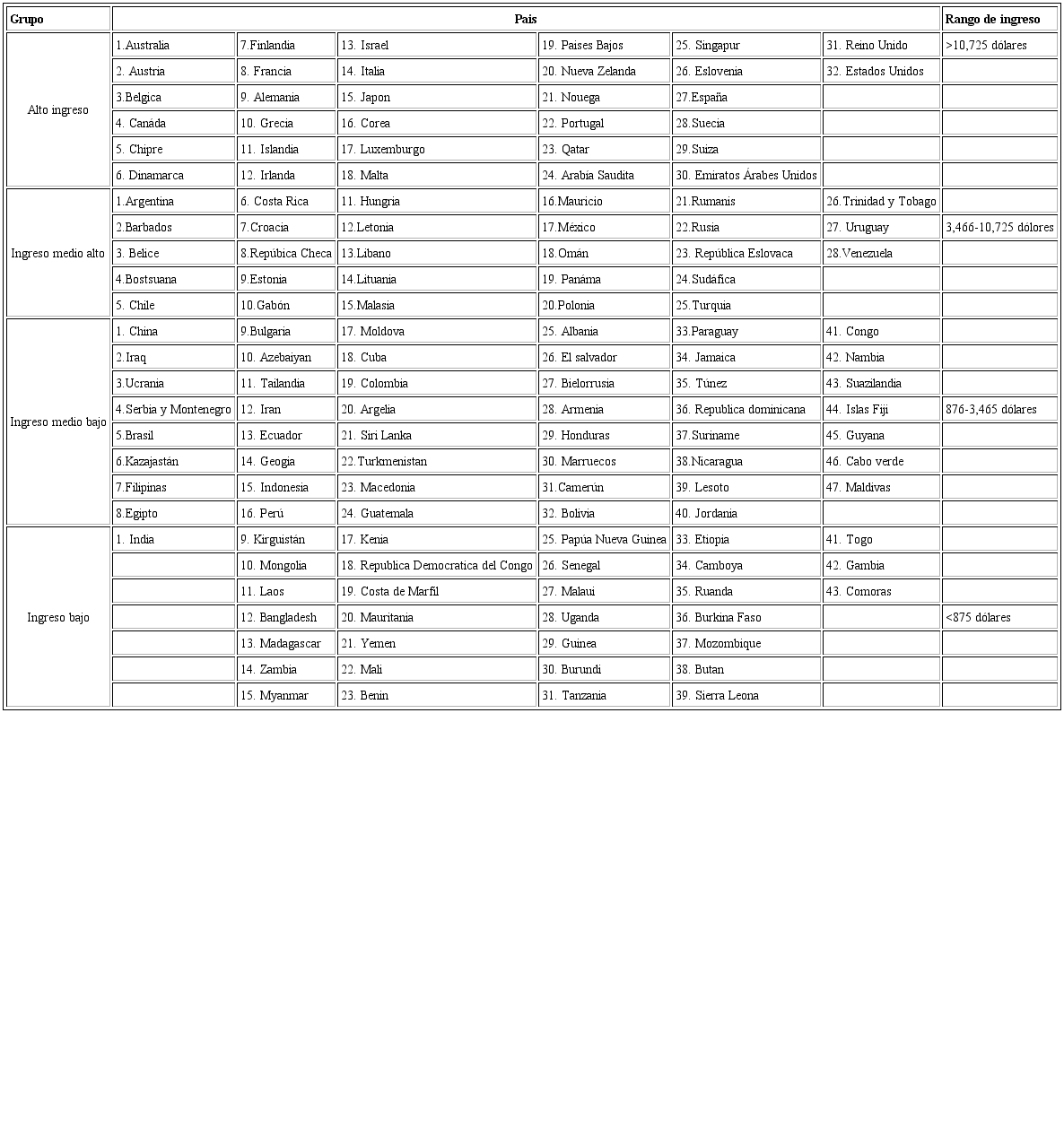 Los países considerados para el análisis se clasifican por ingreso de acuerdo con el Banco Mundial y se muestran en el cuadro 1. El cuadro 2 resume los resultados del cálculo de la huella hídrica manufacturera promedio del periodo 1996-2005 para los países considerados -agrupados por nivel de ingreso-. Un menor nivel de HH de los productos manufactureros es indicativo de un consumo más eficiente del agua como recurso en los procesos productivos.