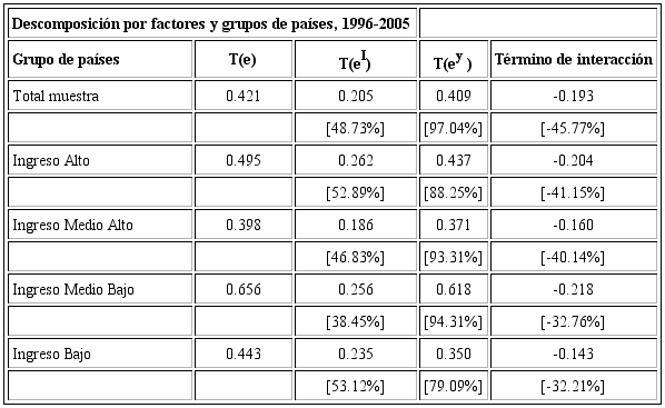 Observando la desigualdad internacional al interior de grupos de países, se tiene que el principal factor determinante del desequilibrio intra-grupos son las diferencias de ingreso. Además, el término de interacción, al representar un componente de ajuste, contribuye en todos los casos a un índice de menor desigualdad, disminuyendo los desequilibrios entre países de cada grupo. En particular, el mayor desequilibrio se registra al interior de las economías de alto ingreso, seguido por aquellas de ingreso medio-bajo. Si bien, las economías de bajo ingreso e ingreso medio-alto muestran índices menores al de la muestra total, caen en rangos próximos al 0.5, considerándose relativamente bajos, pero con aparente potencial de desigualdad, lo que puede evaluarse con nueva información disponible. En general, el factor asociado con la intensidad hídrica muestra una contribución menor a la de las diferencias de ingreso, pero mayor a la del factor de interacción.