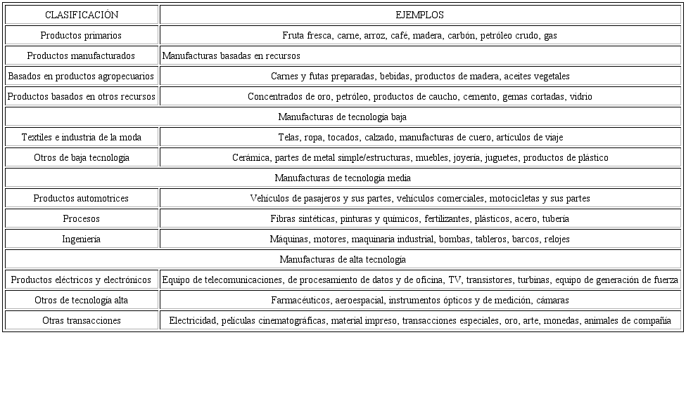 Por último, los productos de tecnología alta (TA) tienen tecnologías avanzadas y rápidamente cambiantes, con inversiones en I&D altas y énfasis primario en el diseño de productos. Las tecnologías más avanzadas requieren infraestructuras tecnológicas sofisticadas, altos niveles de destrezas técnicas especializadas y estrechas interacciones entre las empresas, así como entre empresas y universidades o instituciones de investigación. Los productos representativos de esta clasificación se caracterizan por liderar los sistemas internacionales de producción integrada donde los diferentes procesos son separados y localizados por las empresas transnacionales de acuerdo con diferencias en los costos de producción (Lall, 2000:9). A pesar de que se trata de productos de alta tecnología, resulta interesante ver que algunos productos, como los electrónicos, tienen ensamblado final intensivo en trabajo y su alta relación de valor a peso hace económico localizar esta etapa en áreas de salario bajo como es el caso de México.