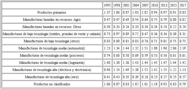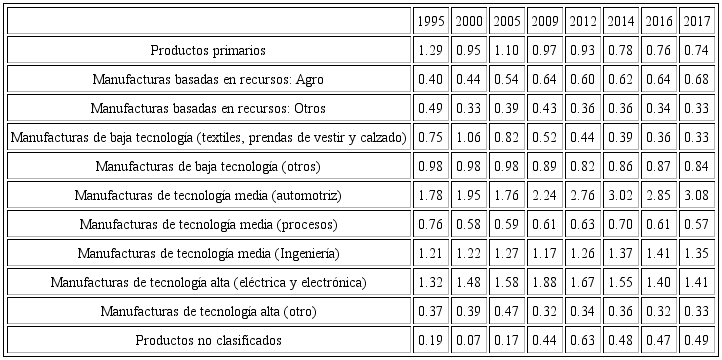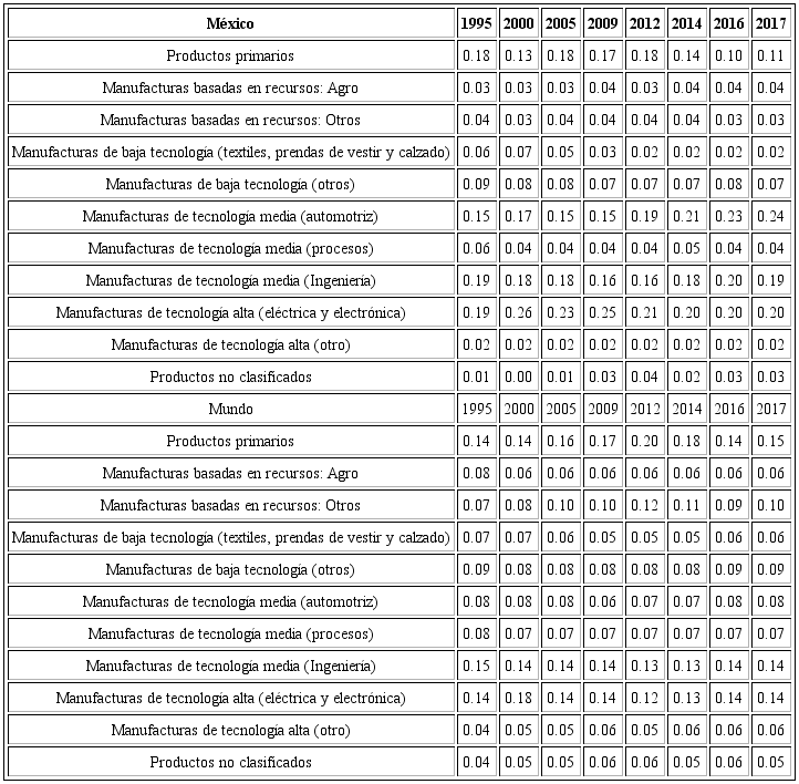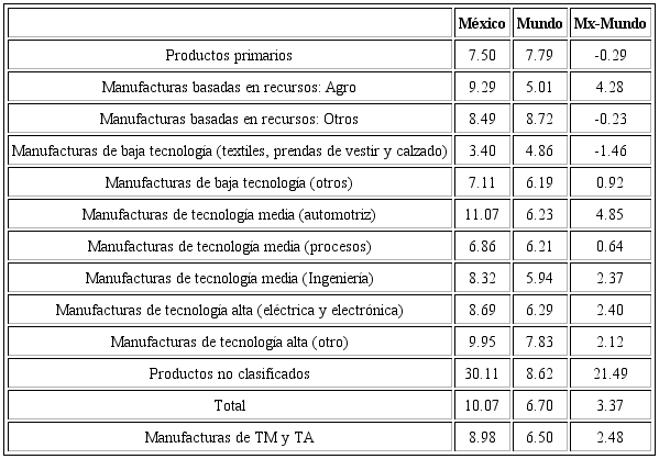 De manera particular, para el caso de México, y enfocados en el periodo de estudio, nuestro país puede ser considerado un exportador con alta incorporación de valor agregado, pues los resultados que se citan en los cuadros y en las secciones precedentes muestran que la participación de las exportaciones de tecnología media y alta en sus exportaciones totales es mayor que la participación de esos rubros en las exportaciones mundiales. Al respecto, no hay que olvidar que México sólo tiene ventajas comparativas reveladas en tres rubros: manufacturas de tecnología media (automotriz e ingeniería) y en manufacturas de tecnología alta (eléctrica y electrónica).