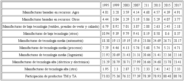 La idea recién esgrimida puede reforzarse si se observa que, en lo que respecta a la participación de las exportaciones de manufacturas de baja tecnología, las exportaciones de México y las mundiales en dichos rubros tenían participaciones similares. Destaca también que las exportaciones de productos textiles, vestuario y calzado de México perdieron importancia dentro de sus exportaciones totales al pasar de representar el 6% de dichas exportaciones en 1995 a representar sólo el 2% a partir de 2012, mientras que la participación de las exportaciones mundiales de textiles, vestuario y calzado mantuvo alrededor del 6% de las exportaciones mundiales desde 2005. Otro ejemplo en este mismo sentido se encuentra en las otras manufacturas de baja tecnología, donde la participación de las exportaciones de estas en las totales de México disminuyó ligeramente entre 1995 y 2017 al pasar del 9% al 7%, mientras que la participación de este rubro en las exportaciones mundiales totales se mantuvo alrededor del 9%. En lo que corresponde a las manufacturas de tecnología media, la participación de este tipo de manufacturas en las exportaciones mundiales permaneció relativamente constante, mientras que en el caso de México destaca el hecho de que las exportaciones de la industria automotriz han aumentado su importancia en las exportaciones totales mexicanas, sobre todo en la segunda década del siglo XXI, al pasar de representar el 15% de las exportaciones totales de México hasta 2009 a alcanzar el 24% de dichas exportaciones en 2017.