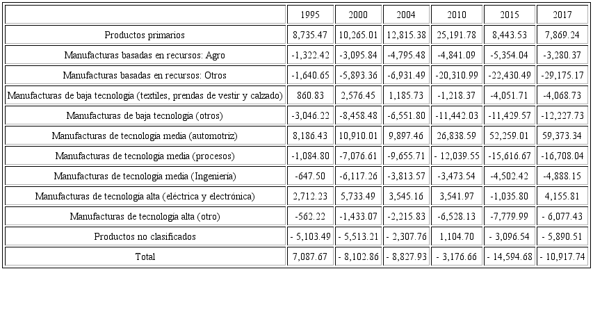 En el cuadro 5 se presentan balanzas comerciales para México según su intensidad tecnológica. Lo que resulta relevante subrayar es que sólo hay dos rubros donde el superávit fue persistente a lo largo de todo el periodo de estudio: productos primarios y manufacturas de tecnología media (automotriz). Hay un caso que llama la atención de manera especial; el de manufacturas de tecnología alta (eléctrica y electrónica), donde se observa un superávit persistente de 1995 a 2010, con déficit en 2011, superávit en 2012 y déficit en el lapso 2013-2016, para tener nuevamente superávit en 20171. Por su importancia para el comercio internacional de manufacturas de México, este es un caso en el que hay que poner especial atención.