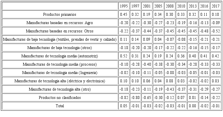 En el cuadro 6 se presentan los índices de la balanza comercial relativa calculados con base en la ecuación 1 para los diferentes rubros de la clasificación de Lall. Se observa que solo en la industria automotriz hay una clara ventaja comparativa, lo que contrasta con lo observado en el cuadro 5, donde no solo la industria automotriz presenta superávit en el periodo de estudio, sino también los productos primarios y en algunos años del periodo de estudio también las manufacturas de alta tecnología (eléctrica y electrónica).