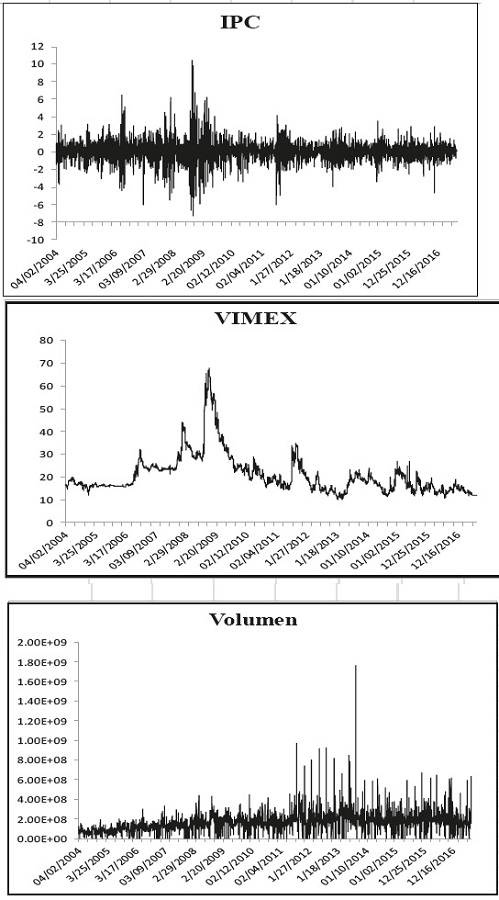 En la gráfica 1 se presentan las gráficas de los rendimientos del índice accionario mexicano (IPC), la volatilidad implícita del IPC (VIMEX) y el volumen de operaciones de las acciones que conforman el IPC.