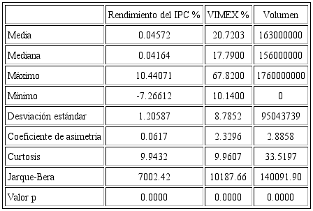 En el Cuadro 1 se presentan las estadísticas descriptivas de los rendimientos continuos del IPC, la volatilidad implícita (VIMEX) y del volumen de operación.
