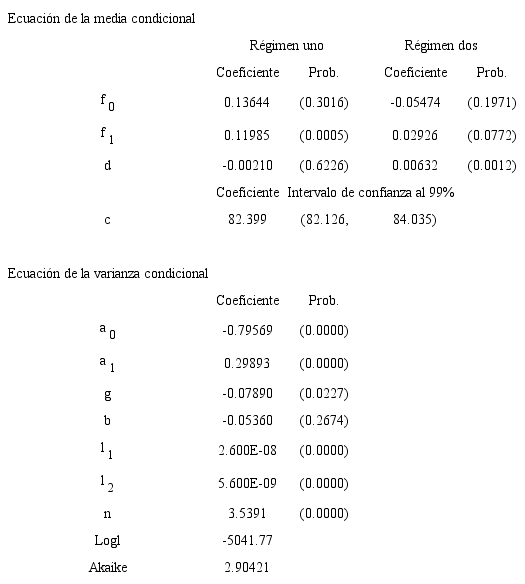 La parte superior presenta la estimación de la media condicional mediante el modelo de cambio de régimen con dos regímenes. Se muestran los estimadores puntuales y los valores entre paréntesis son los valores p (p-value) de los parámetros estimados. En la parte inferior de la ecuación de la media se presenta la estimación del umbral junto con un intervalo de confianza al 99%.