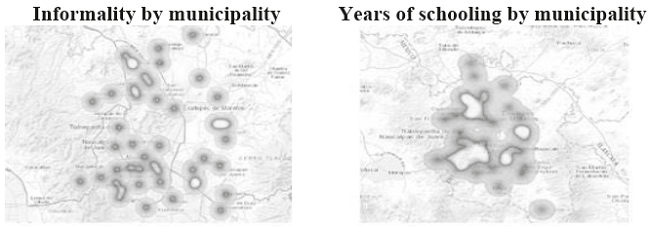 According to the econometric results, previously exposed, we can summarize that the phenomenon of informality is present within the entire ZMVM, but in different magnitudes. Where there are high levels of schooling, the presence of informality is lower and vice versa. However, there is no strong spatial relationship since there may be localities with low levels of education that are neighboring high-level study localities -so the neighborhood factor does not influence (in a positive or negative way) another locality in its informality level, as a norm generalized within the ZMVM.