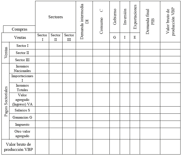 La representación gráfica de esta matriz se da en una tabla, conformada por los sectores de la economía como filas y columnas (Figura 1). Cada fila y columna se encuentran pertinentemente relacionadas por sector, según lo menciona Leontief (1949).