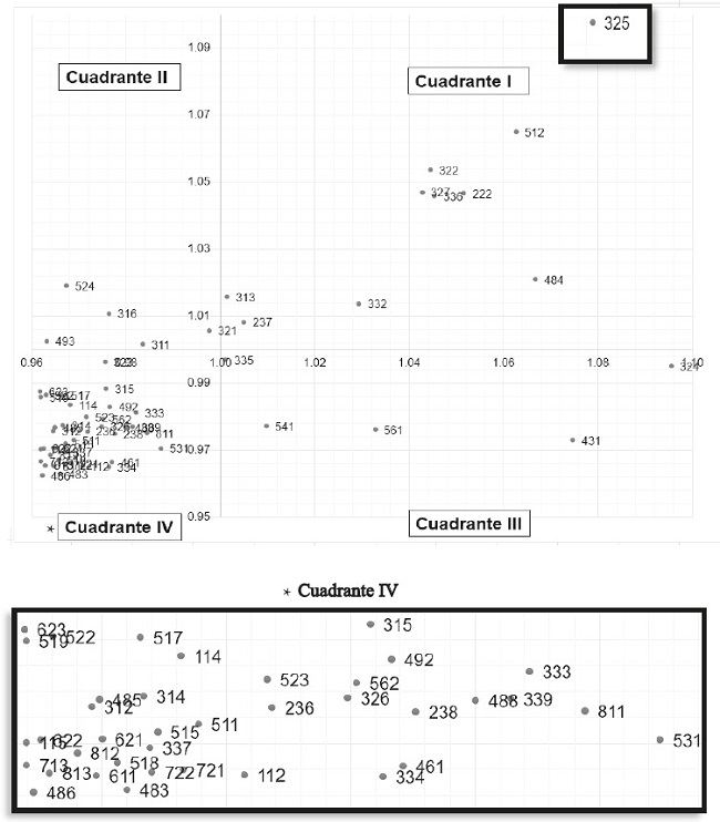Cuadrante IV: Donde Vj y Vi son menores que 1, un sector que no se encuentra del todo asociado con los demás y por consiguiente no es un integrante primordial del sistema productivo regional.