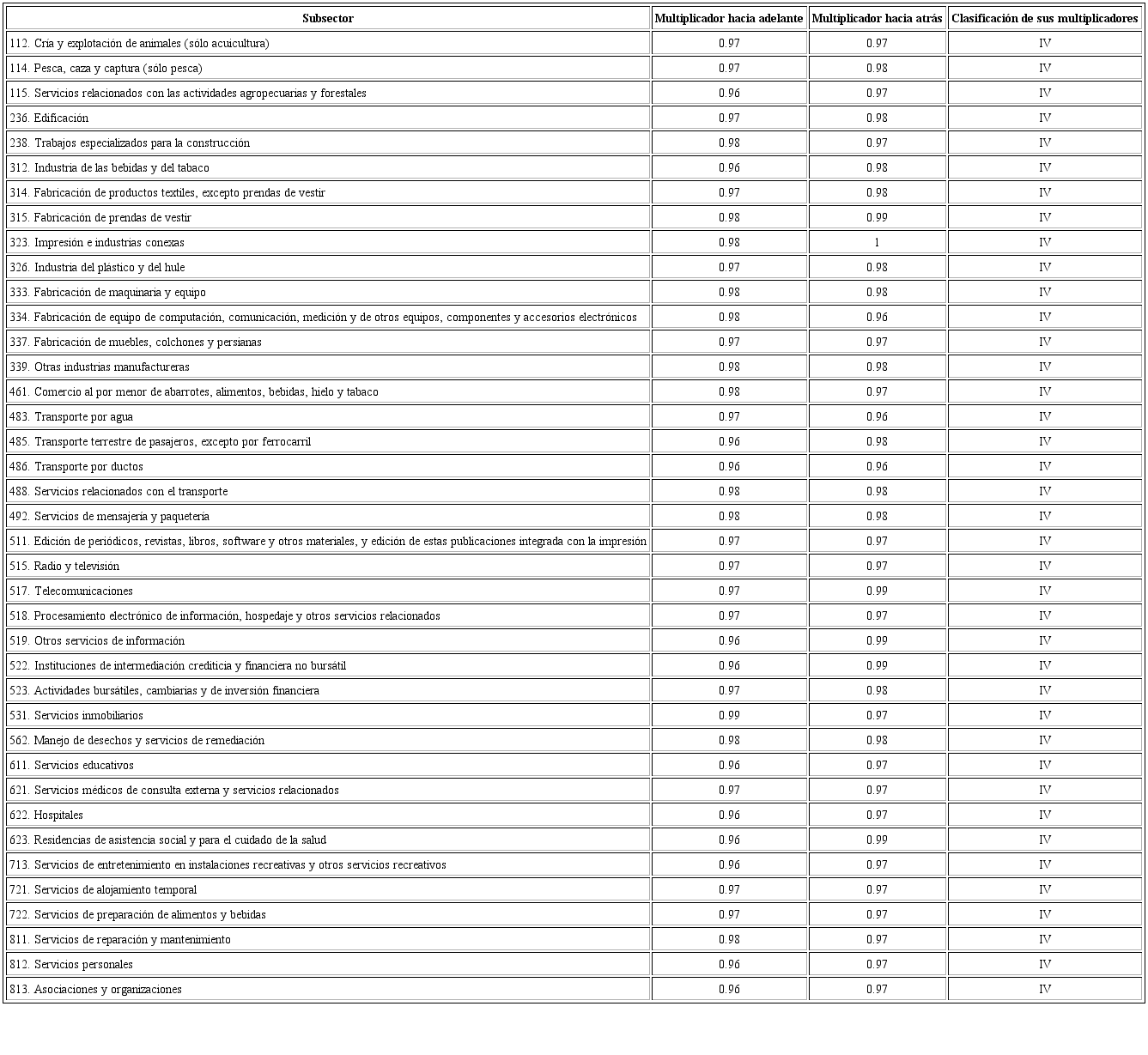 Los crecimientos mencionados pueden indicar la existencia de un patrón de aglomeraciones, o a nivel muy agregado, los sectores que más crecen o generan empleos. Sin embargo, esta información es insuficiente para los decisores de política económica o para la elaboración de una estrategia de desarrollo regional, que pretenda identificar aquellos sectores claves con mayor capacidad de arrastre y potencialidades para influir sobre el desarrollo económico regional, o determinar cuáles son los sectores o ramas de mayores efectos multiplicadores sobre el resto de la economía.