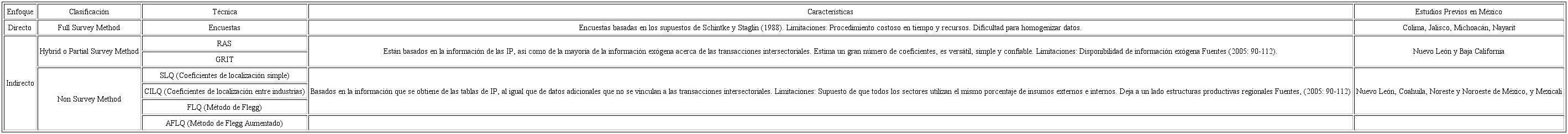 Una Matriz Insumo Producto a nivel regional permite un análisis desagregado del comportamiento productivo de una región. En el caso de los estudios estatales se puede utilizar el modelo nacional regionalizado con la información del sistema productivo del mismo. La información arrojada resulta en una matriz simétrica de las transacciones monetarias intra-sectoriales del Estado que tiene una amplia variedad de usos para el análisis del sistema económico y las cadenas productivas regionales. Como se mencionó con anterioridad, para poder realizar un estudio de carácter regional a nivel Estado, es de suma importancia regionalizar la información obtenida de la MIP nacional pues corresponde a un diferente orden geográfico. Existen diversas técnicas utilizadas para regionalizar una Matriz de Insumo Producto. A continuación, se muestra una clasificación (tabla 2).