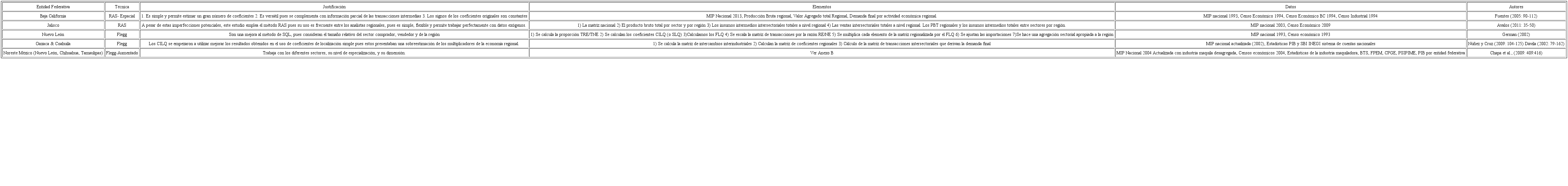 A continuación, se muestra una tabla que resume las metodologías de regionalización de la MIP utilizadas por distintos autores, para los diversos Estados de la República Mexicana (tabla 3).