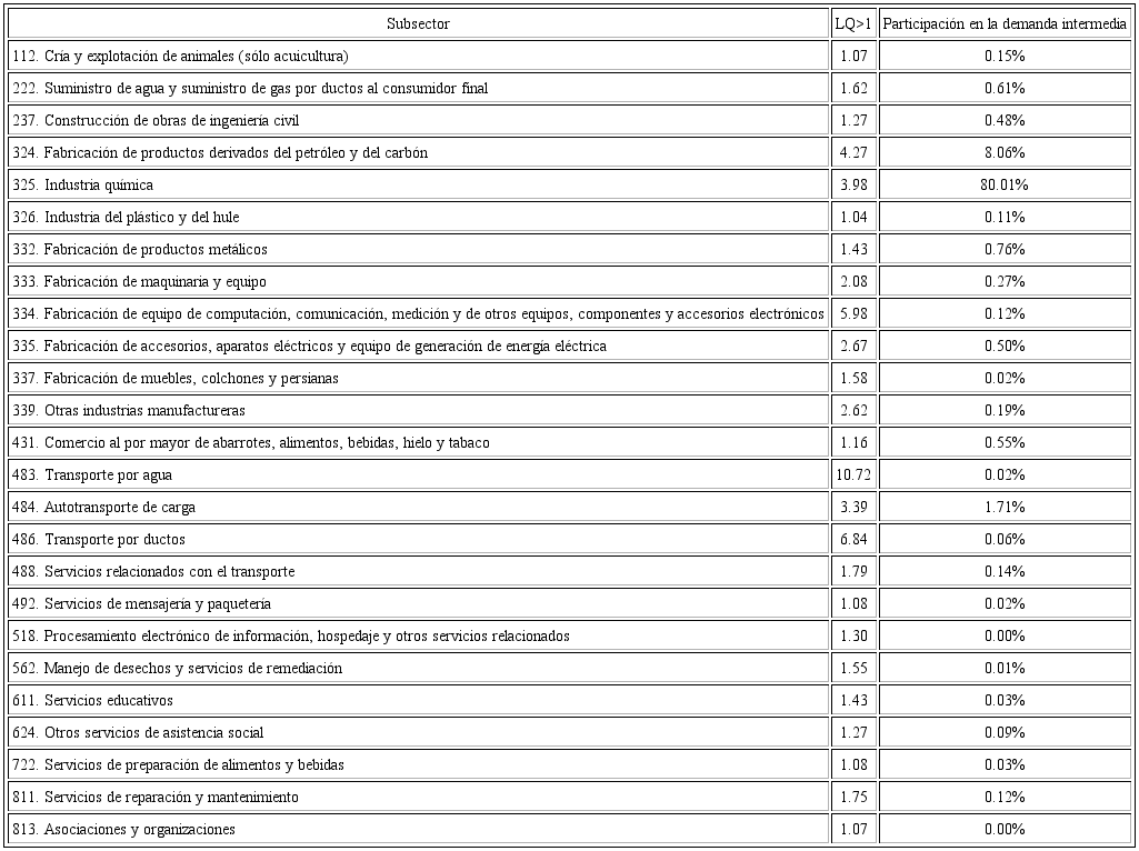Dentro de la industria manufacturera, se encuentra un alto nivel de concentración a la industria química, que representa por sí sola el 80% de la demanda para consumo intermedio. Destaca también dentro del mismo rubro la fabricación de productos derivados del petróleo y del carbón, con un 8% de la DI de consumo. Podemos observar como el autotransporte de carga representa por arriba del uno por ciento de la DI. Los subsectores con coeficiente de localización mayor a uno son sectores que se suponen, abastecen la demanda regional y, por consiguiente, exportan bienes o servicios (tabla 4) (Núñez Rodríguez y Cruz Ramírez, 2009).