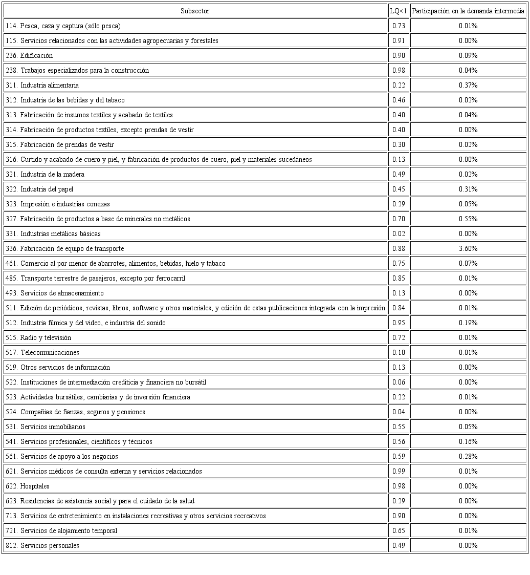 Los sectores de la economía tamaulipeca que presentan un coeficiente de localización menor a 1, requieren de importación de bienes o servicios para la satisfacción de la demanda regional (tabla 5) (Núñez Rodríguez y Cruz Ramírez). Los índices de concentración más bajos pertenecen a las instituciones de intermediación crediticia y financiera no bursátil con apenas un .06 de LQ y una participación en la DI de consumo menor al 1%. En la industria manufacturera, varios subsectores están poco localizados en el estado y con muy escasa capacidad de satisfacer la DI, algunos con importante presencia en algunos municipios del estado, lo que demuestra escasa relación con la industria local y su encadenamiento a sectores que están localizados fuera del estado.