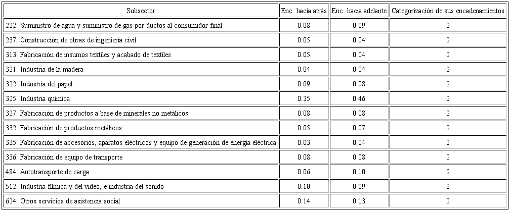 Utilizando los índices de Chenery y Watanabe (1958:487-521), se calcularon los encadenamientos entre los subsectores de la economía tamaulipeca (tabla 6). Se categorizan en el número 2 como aquellos subsectores que abastecen la demanda de insumos intermedios regional. Dichos rubros (222, 237, 313, 321, 322, 325, 327, 332, 335, 336, 484, 512, 624) representan eslabones importantes de la cadena productiva, por la dependencia que los otros sectores tienen de los productos que elaboran, o servicios que brindan.