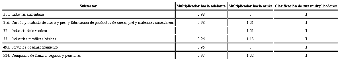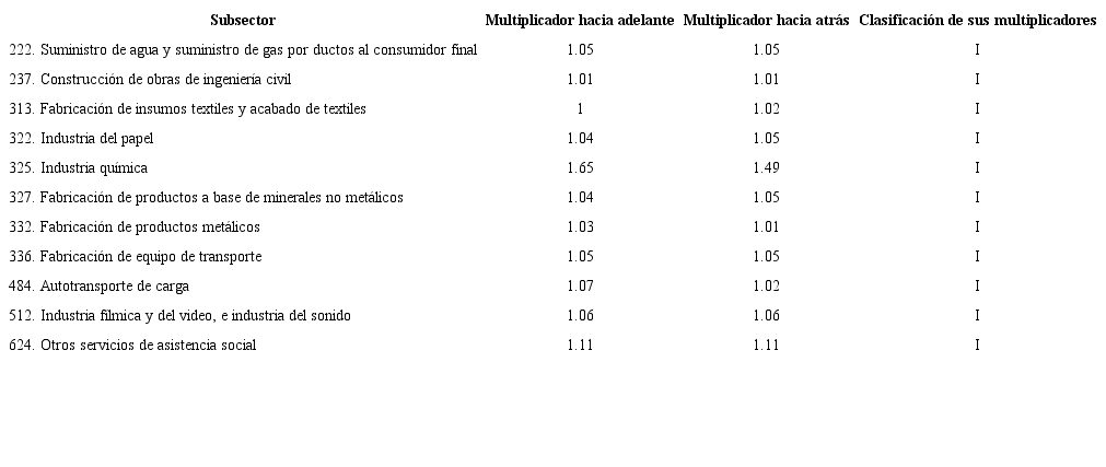 Los subsectores 311, 316, 321, 331 y 524 representan a las industrias con una notoria capacidad de arrastre o consumo intersectorial. El resto de las industrias que arrojan coeficientes por debajo de 1 (entre más es su cercanía al 0), su presencia en las cadenas productivas regionales es escasa, en tanto sus relaciones compraventa son débiles dentro del sistema. La gráfica 1 nos muestra los cuadrantes representativos de la clasificación de los sectores de la economía, y el esparcimiento de los multiplicadores ponderados por industria. El eje x representa la coordenada obtenida por el multiplicador hacia adelante del sector, y el eje y la coordenada del multiplicador hacia atrás. Podemos observar cómo un total de 11 industrias se encuentran en el cuadrante I que es el denominado como clave, 6 industrias forman parte del cuadrante II que se considera como estratégico hacia adelante, 5 sectores se clasifican dentro del cuadrante III que es representado como estratégico hacia atrás, y el resto de las industrias se muestran como independientes del sistema económico (Anexo A).