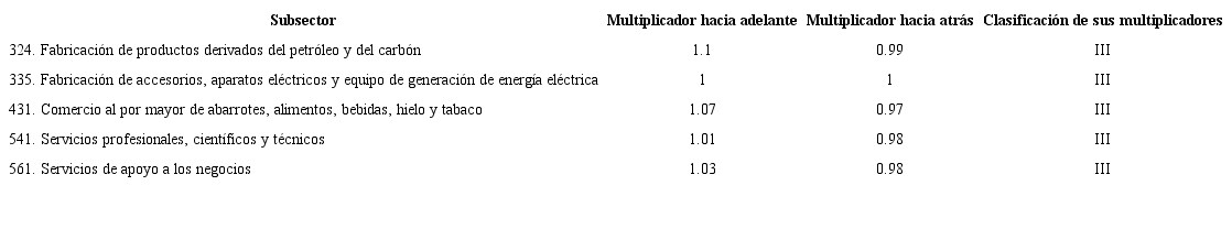 Para la clasificación de los sectores de acuerdo con la relevancia en su entorno económico se utilizaron multiplicadores ponderados, basados en los coeficientes técnicos y coeficientes de distribución. Las industrias 222, 237, 313, 322, 325, 327, 332, 336, 484, 512 y 624 (Anexo A) se muestran como sectores estratégicos de la economía tamaulipeca con un alto nivel de interacción representada a través de las transacciones intersectoriales de la región. Entre estos subsectores mencionados, la mayor presencia corresponde a la industria manufacturera del estado. Lo que confirma la importancia regional, en capacidad de abastecer la propia demanda interna. Los subsectores 324, 335, 431, 541 y 561 se categorizan como industrias proveedoras de insumos dentro del sistema económico regional (encadenamiento tipo 1).